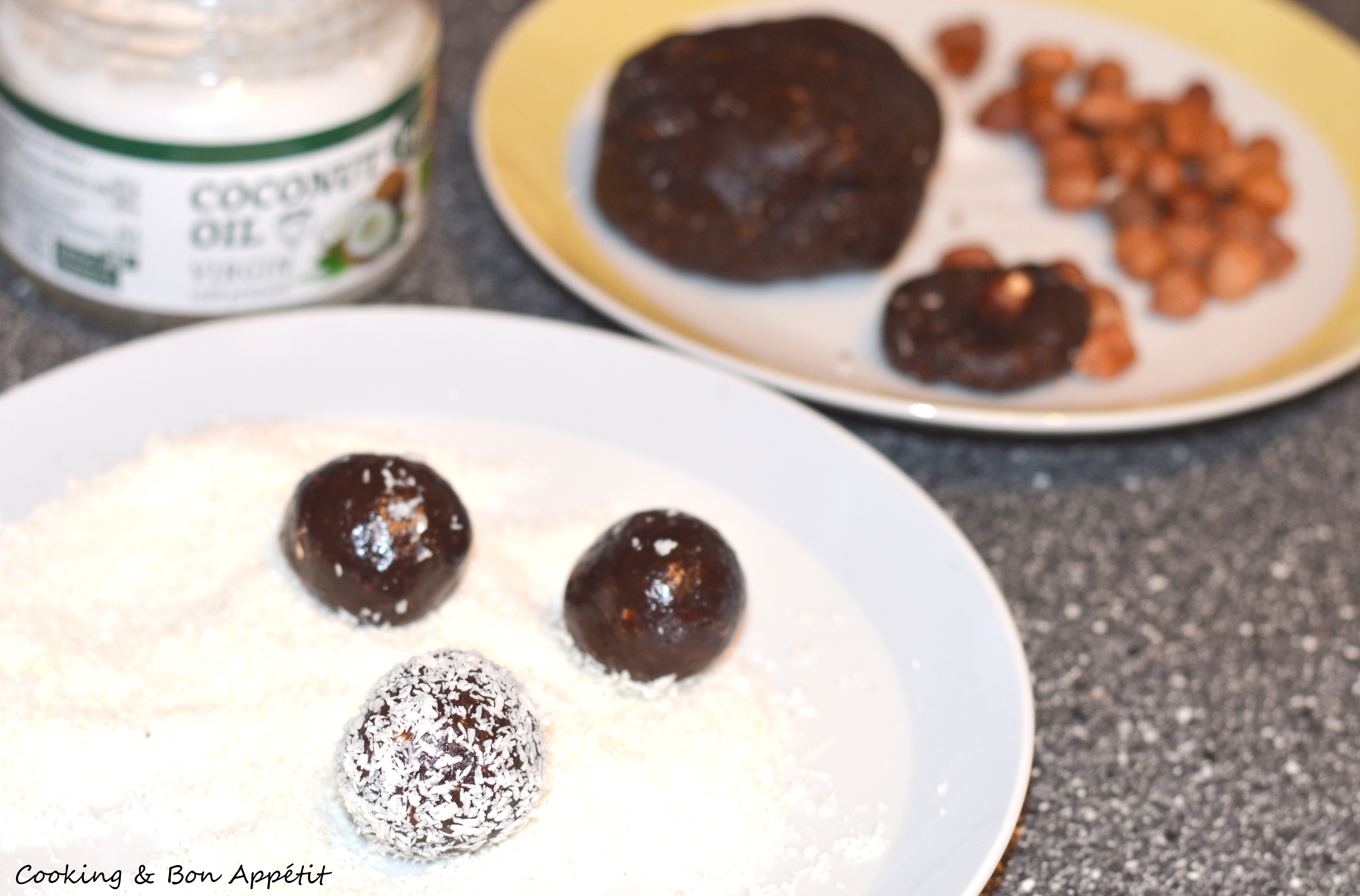 Poppy is the organizer of the Bataille Food #39: a French food challenge created by Jenna, from the blog Bistro de Jenna. The aim is to share recipes between bloggers and non-bloggers, following a theme and 2 specific ingredients. Nominated by Lucie and Ariana, from the fantastic blog Cosmic tomatoes thanks to her Boeuf Bourguignon inspired by the movie Julie & Julia, Poppy decided to challenge us on raw cooking, from raw ingredient to a raw complete dish, using an oil – I chose coconut oil, and some sort of nuts – I used cashew nuts, hazelnuts and coconut. You can replace hazelnuts by peanuts, macadamia nuts or pecan nuts ^^ I have eaten some of these brownie balls and I offered the rest to a colleague for her birthday: she was really pleased by these energy brownie snacks 😉 Of course please be careful with nut-allergic people if you offer this recipe 😉