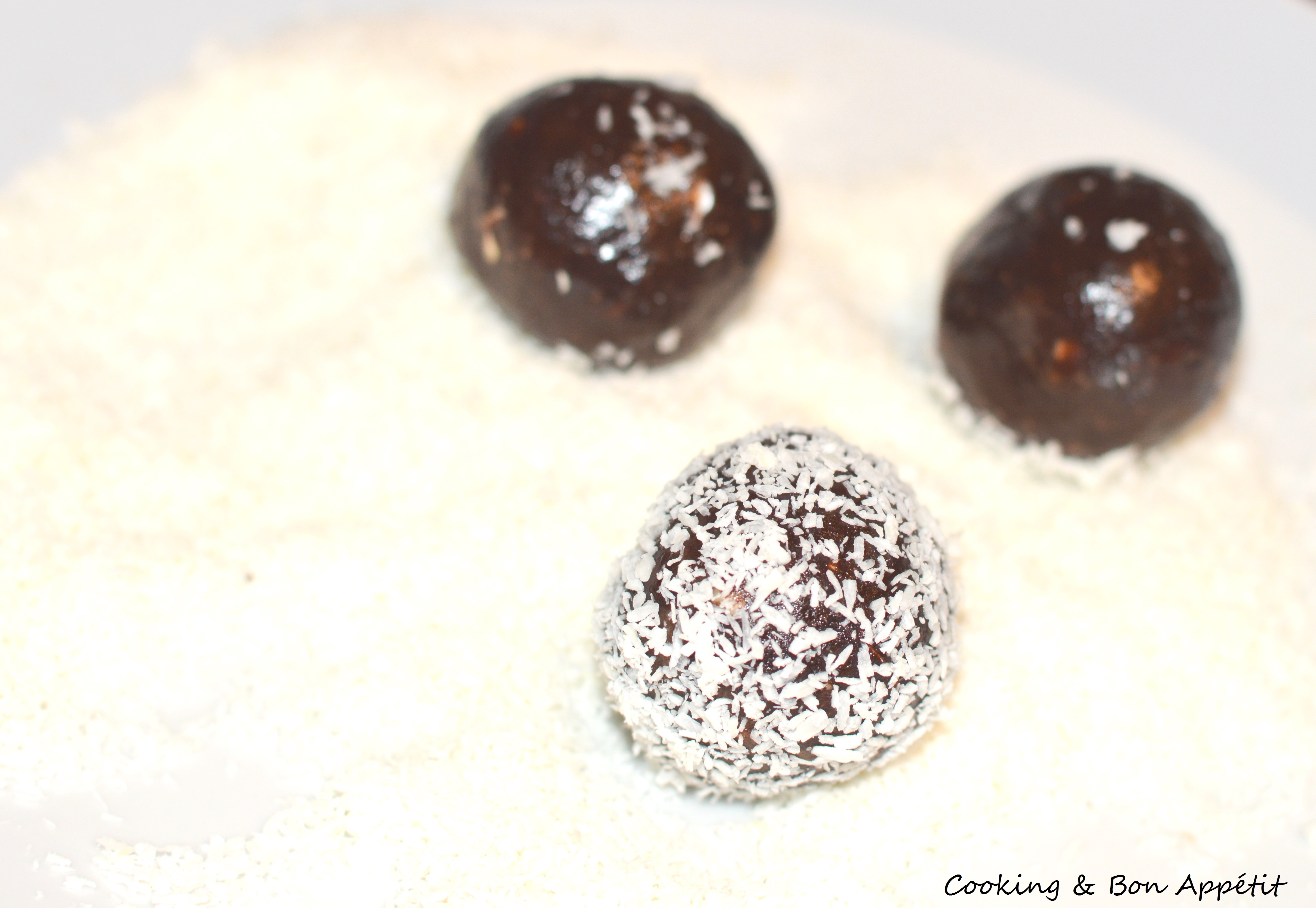 Assurez-vous de garder vos mains légèrement huilées lorsque vous formez les boules, cela vous éviteras d’avoir de la pâte au chocoalt collante partout – bon, cela peut aussi être un prétexte pou se lécher les doigts :p - Roulez la boule dans la paume de votre main afin d’avoir une jolie sphère puis roulez-la dans la noix de coco râpée, et c’est prêt !