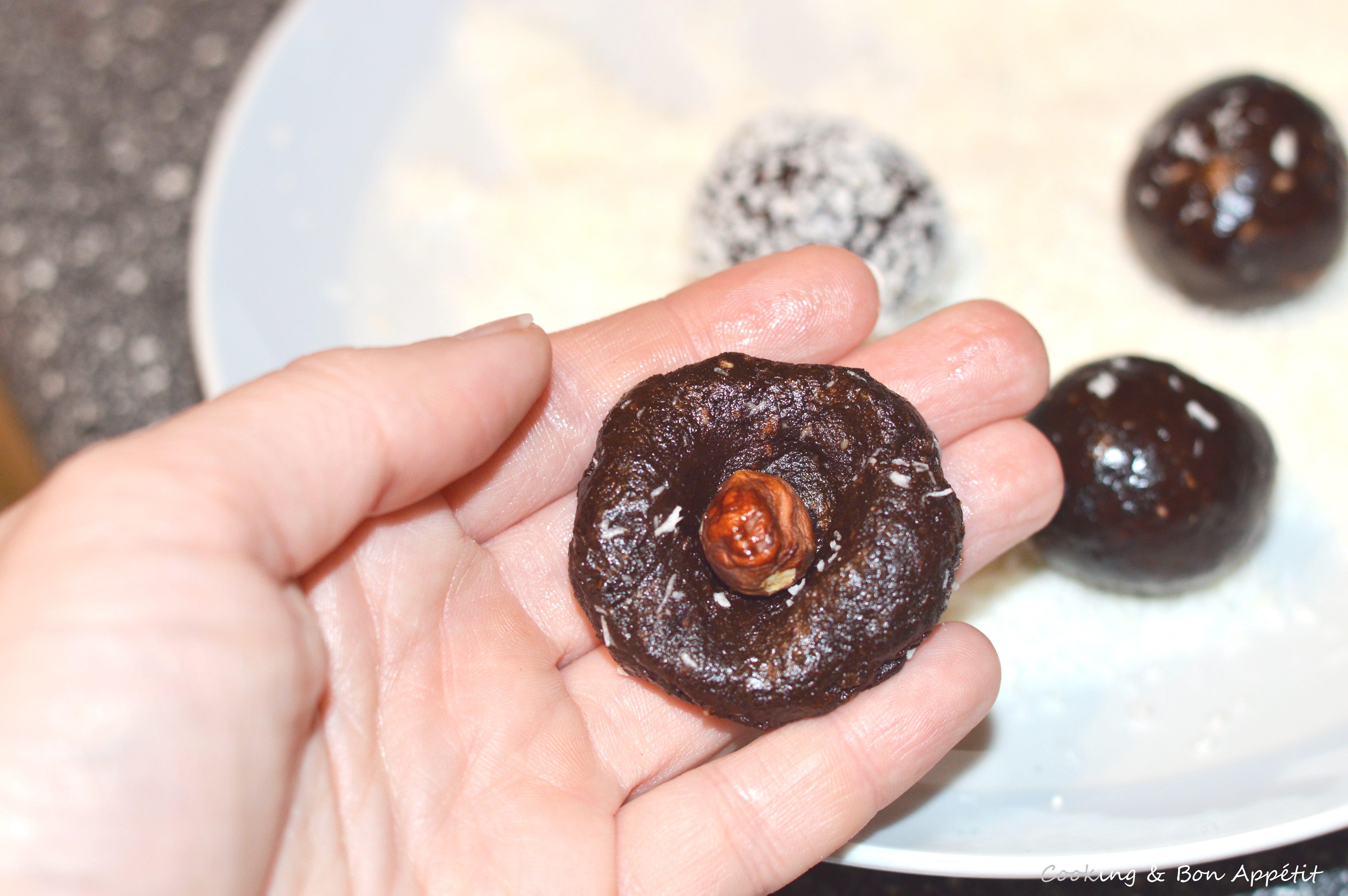 - Scoop out tablespoons of the mixture, place a hazelnut in the middle of each and roll into balls with your hands,