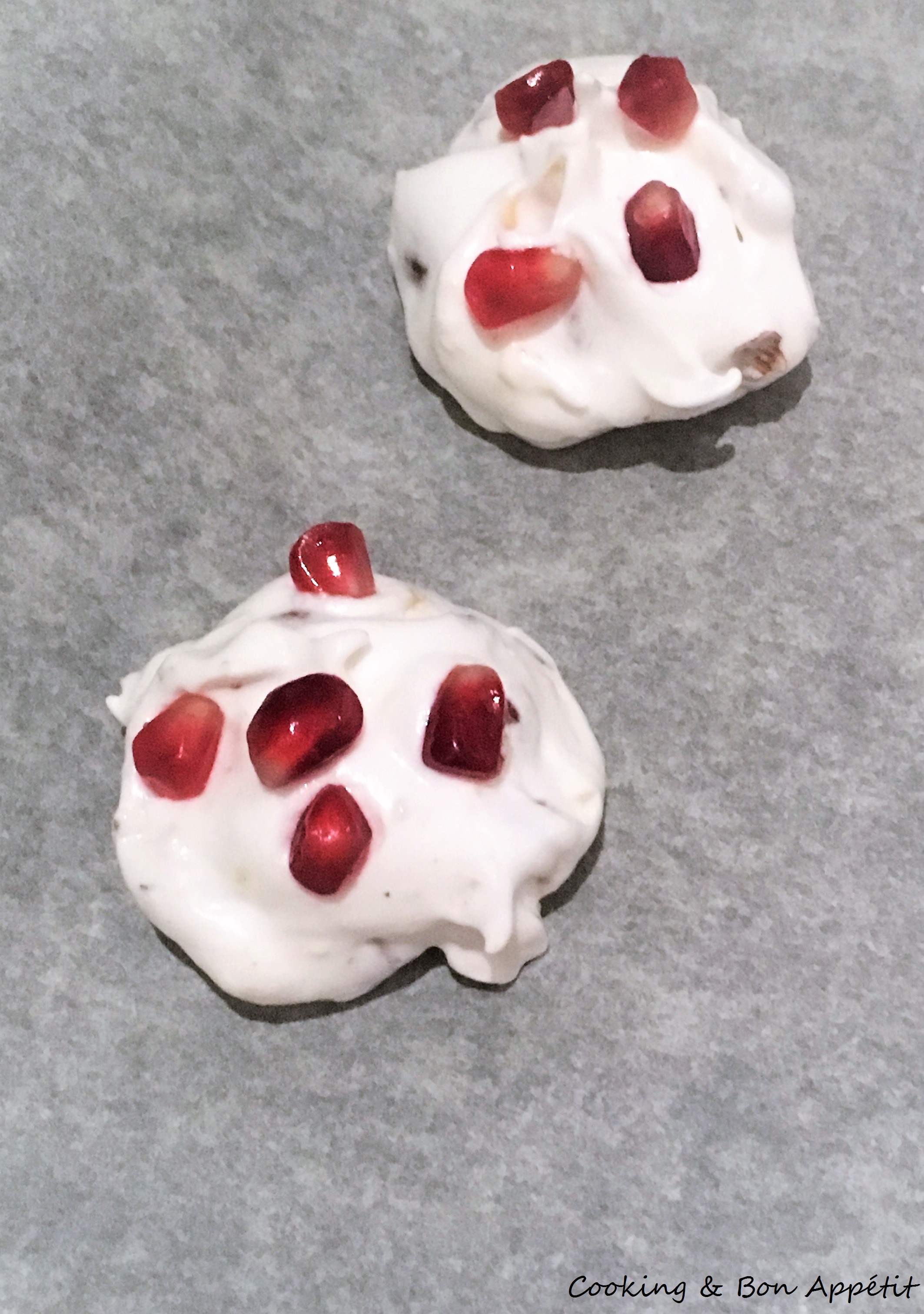 These little treats are between meringue kisses and cookies, very crunchy with all the hazelnuts and almonds. If I remember well, this recipe is inspired by Eleonora Galasso, an Italian blogger I have been following for a few years now –check her Instagram here. Pomegranate gives to these cookies a perfect twist and also an original touch as usually you don’t bake pomegranate. The meringue is not a traditional Italian meringue as there is some honey in it and also because you bake it at a pretty high temperature giving them a nice golden brown color. Full of nuts, they do not really shape well and are not really pretty; but they are so good, I am sure you’ll give them a try. 😉