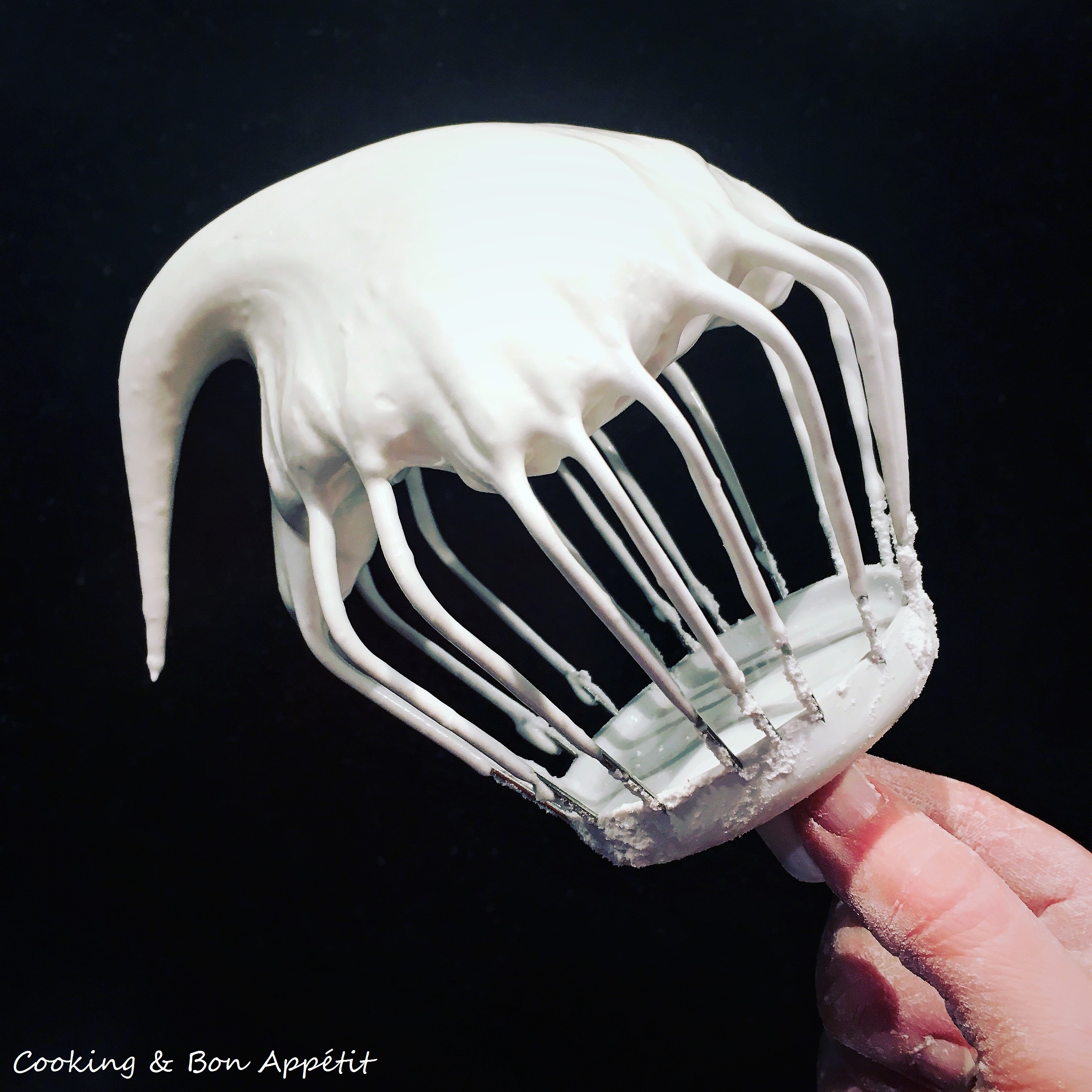 - Keep beating while you add very slowly the syrup, beat about 5 minutes and gradually add remaining confectioner’s sugar, carry on beating until nice and glossy and until stiff peaks form –we call it bird beak in French,